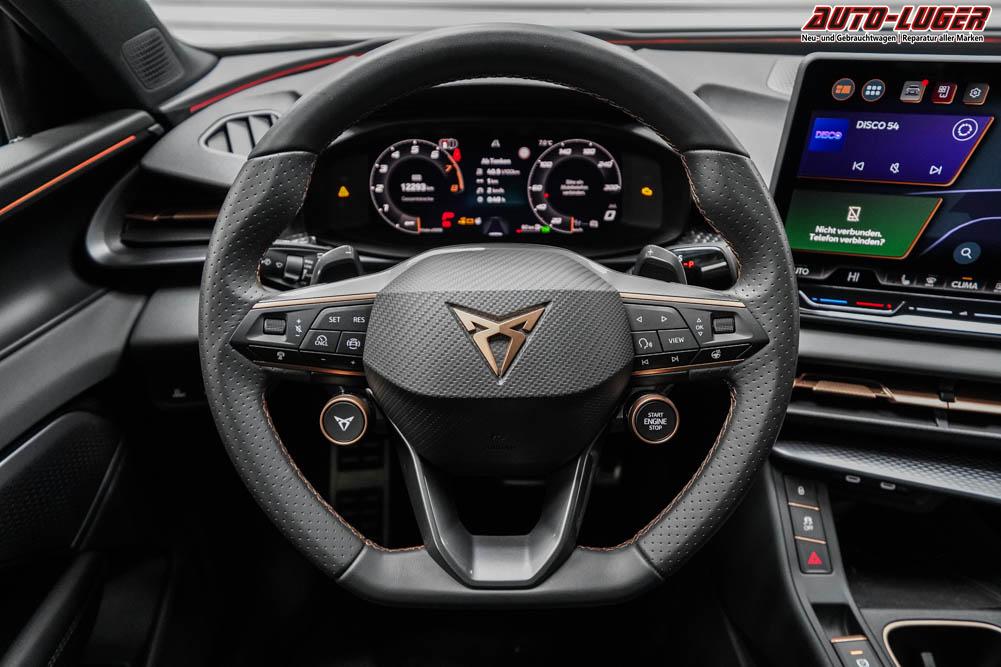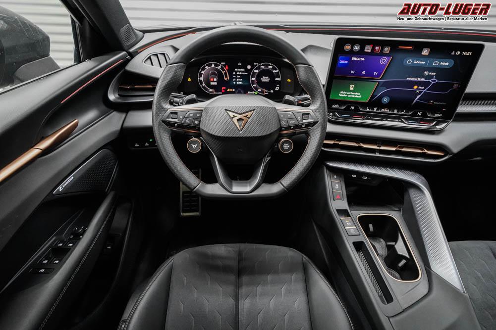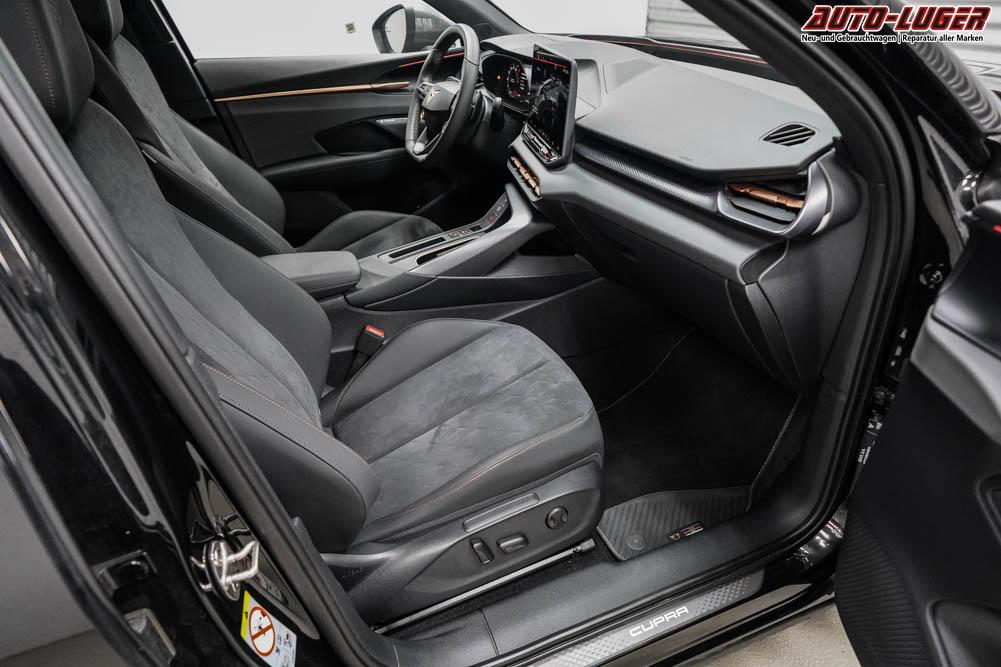 Beifahrersitz elektr. höhenverstellbar, Fahrersitz höhenverstellbar, Sport-Lederlenkrad, Lendenwirbelstütze, Mittelarmlehne vorne, Sportsitze, Gepäckraumabdeckung, Lenkrad höhenverstellbar, Sitzbezug Dinamica, Ambiente-Beleuchtung, Elektrisch verstellbarer Fahrersitz mit Memory Funktion, Beheizbares Lenkrad, Multifunktionssportlenkrad, Isofix, Isofix Beifahrersitz, abgedunkelte Scheiben, 20 Zoll Alufelgen Gravity, Dachreling schwarz, ABS, Alarmanlage, Außenspiegel elektrisch anklappbar, Fensterheber elektrisch, Kopfairbags, Schiebedach, Seitenairbags, Servolenkung, Sitzheizung, ESP, Wegfahrsperre, Zentralverriegelung mit Funk, Außenspiegel beheizbar, Beifahrerairbag, Fahrerairbag, Parkpilot hinten, Parkpilot vorne, Reifendruckkontrolle, Head-up Display, Regensensor, Lichtsensor, Digital Cockpit, Tempomat Abstand ACC, Spurhalteassistent, Verkehrszeichenerkennung, Full LED-Scheinwerfer, Tagfahrlicht, Pannenset, Rückfahrkamera, Panoramadach, Elektrische Heckklappe inkl. Virtual Pedal, KeylessEntry, StartStopSystem, Innenspiegel automatisch abbl., Müdigkeitswarnsystem, Notrufsystem, Schaltwippen, Klimaautomatik 3-Zonen, Android Auto, Apple Carplay, Freisprecheinrichtung, Induktionsladestation, Sprachsteuerung, USB Typ-C, Radio DAB, Bluetooth, Bordcomputer, Radio-Navigationssystem High, IMMERSIVE by Sennheiser, Schalensitze vorne, AHK Vorbereitung, Cupra Full Link, variabler Ladeboden, Performance Reifen, erweiterte Herstellergarantie 5 Jahre/100.000km,